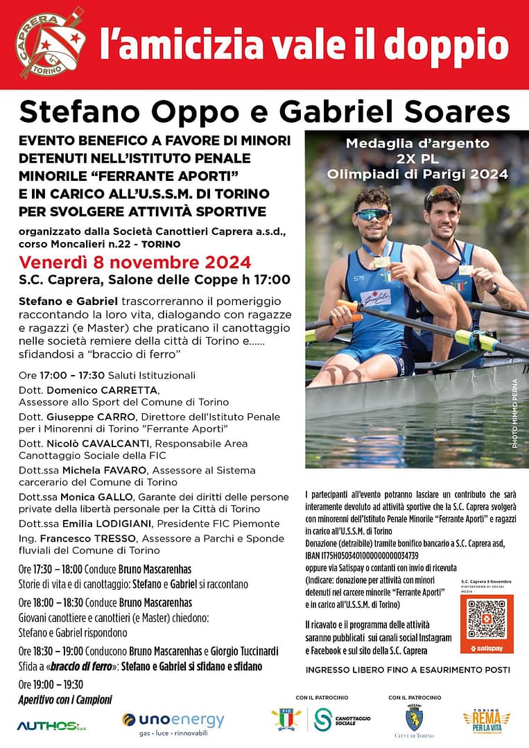 Non solo campioni nello sport, ma anche nella vita! Stefano Oppo e Gabriel Soares sono intervenuti alla serata di beneficenza promossa dalla Società Canottieri Caprera, raccontando le loro esperienze e ispirando una nuova generazione di canottiere e canottieri. Grazie a questa iniziativa sono stati raccolti fondi sufficienti a permettere il proseguimento del progetto “Remare in Libertà” per un altro anno sportivo. La Società, essendo hub del Canottaggio Sociale per il Piemonte, si è sentita in dovere di rispondere all’appello, arrivato dall’USSM di Torino, e trovare un modo per consentire alle ragazze e ai ragazzi in carico ai Servizi Sociali di tornare a remare sulle acque del Po… in Libertà! Gli istruttori societari si recheranno anche all’interno dell’IPM Ferrante Aporti, affinché il progetto possa essere svolto nella sua interezza. Numerose le autorità intervenute tra cui vogliamo citare, per la loro particolare sensibilità mostrata verso la Società, la dottoressa Monica Gallo (Garante dei diritti delle persone private della libertà personale per la Città di Torino), il dottor Giuseppe Carro (Direttore dell’Istituto Penale per i Minorenni di Torino), l’ingegnere Francesco Tresso (Assessore ai Parchi e alle Sponde fluviali per la Città di Torino) e l’avvocato Emilia Lodigiani (Presidente del Comitato Piemonte della Federazione Italiana Canottaggio). Una menzione particolare va riconosciuta al dott. Nicolò Cavalcanti (Responsabile Area del Canottaggio Sociale per la Federazione Italiana Canottaggio), non solo per essersi collegato da remoto nonostante i numerosi impegni, ma soprattutto per essersi profuso affinché la serata potesse svolgersi nel migliore dei modi. Grazie ai suoi numerosi suggerimenti il progetto Remare in Libertà continua a Torino!